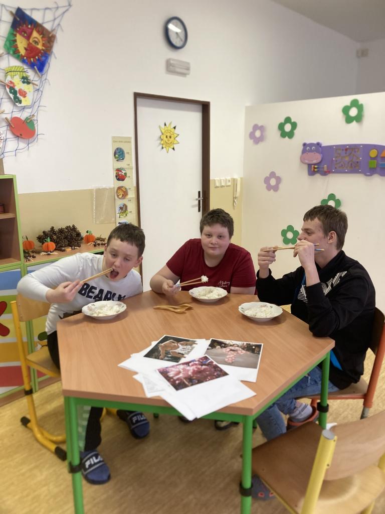 pomůcku do zeměpisu, četli pohádku, zkoušeli manipulaci s jídelními hůlkami, řešili