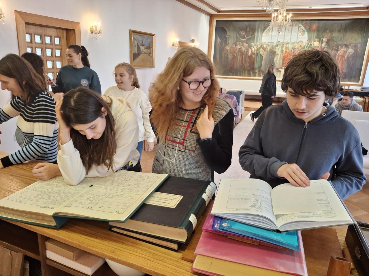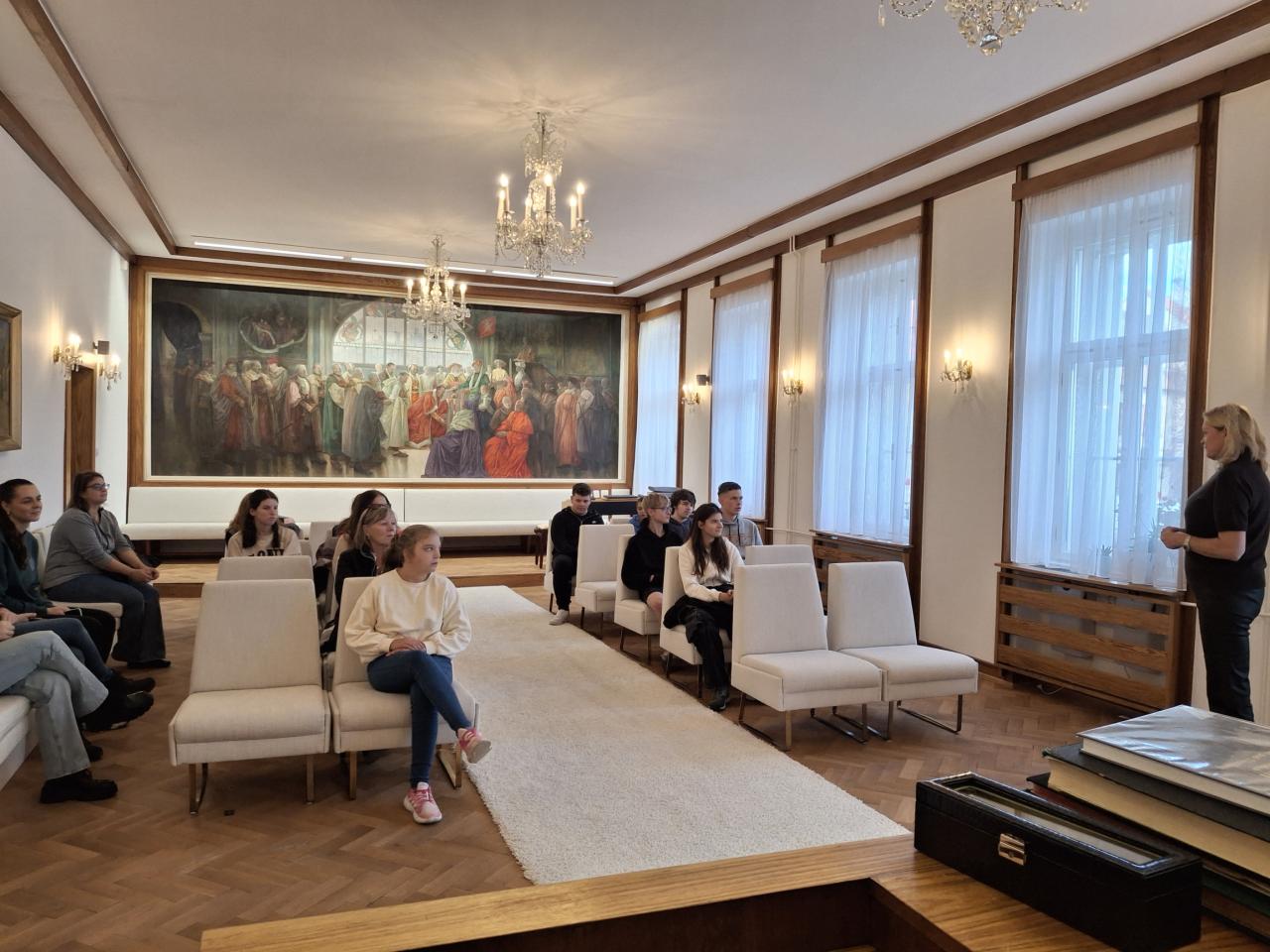V úterý 21. 10. nás na rožmitálské radnici srdečně přivítala matrikářka paní Renata Sklenárová. Dovedla nás do obřadní síně a ujala se slova. Překvapil nás zrenovovaný interiér a výzdoba této místnosti; prozkoumali jsme také detaily obrazů. Paní Sklenárová objasnila žákům význam matriky, jaké tu probíhají obřady, ukázala staré matriční knihy, vysvětlila některé zákonitosti a pravidla zápisů. Děti měly možnost si knihy prohlédnout; podivovaly se nad tvary písmen, zkusily si i některé zápisy přečíst. Také jsme viděli Kroniku města a našli jsme kapitolu o naší škole. Žáci měli různé dotazy, takže došlo i na povídání o historii radnice, o funkci starosty, o zastupitelstvu, o volbách; nakonec jsme si prohlédli i zasedací místnost, kde se konají schůze. Dvě hodiny zajímavého vyprávění utekly, ani nevíme jak. Rádi bychom tímto poděkovali paní Sklenárové za čas, který nám věnovala, za vstřícnost, ochotu a praktické informace, které žáci uplatní v další výuce.